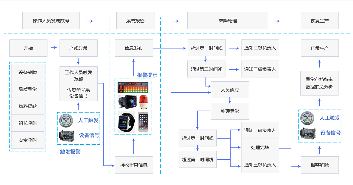 安燈系統(tǒng)管理生產的整個過程,自動糾正生產過程中的錯誤,通過實時監(jiān)控生產過程中的所有緊急事件并提供決策支持,以達到生產調度的要求;在生產計劃出現(xiàn)異常或偏差時,及時向有關人員反饋,進而采取適當措施,最終實現(xiàn)資源平衡和優(yōu)化配置,實現(xiàn)制造時間和成本的優(yōu)化,實現(xiàn)整體優(yōu)化的目標。